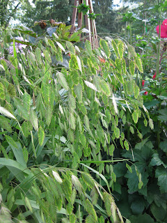 Chasmanthium latifolium) out in the gardens. The seedheads will go from green to tan to bronze later in the season. This grass reseeds a bit but is one of my favorites for durability in full sun or part shade. Below is the 8" wide bloom of the hybrid mallow (