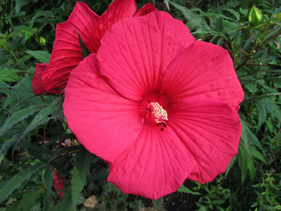 Hibiscus hybrida) called 'Cranberry Crush'. These large blooms are on sturdy, 4' tall stems and are quite showy for a couple of weeks. The beetles are working on the flowers and foliage but I found at least one "as-yet-to-be-despoiled" bloom!