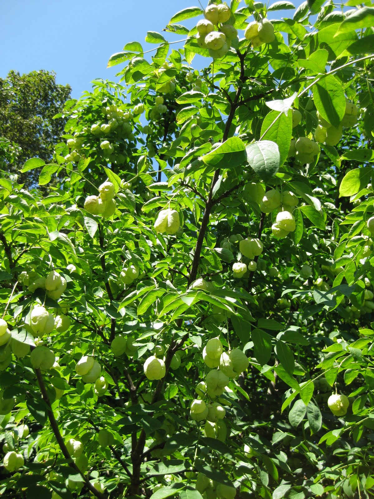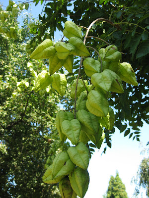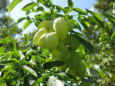 www.fernwoodbotanical.org/) in Michigan, we had it growing as an understory tree (15' tall or so) along streams and other waterways. The white flowers of this tree in spring are sightly but the pods steal the show later in the season. This specimen was seen at the Chicago Botanic Garden. Further below are the three-chambered, inflated bladder-like pods of the goldenrain tree (