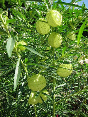 Gomphocarpus physocarpus) which is also known as hairy balls or the "family jewels" plant. This milkweed relative (native to Africa) is grown as an annual in our climate and will reach heights well over 6' tall. This plant is grown for those inflated pods which have long been used in arrangements and also evoke occasional giggles.