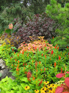 Mirabilis jalapa 'Limelight') that has chartreusy foliage that is sometimes bicolored as seen above and bright fuchsia pink blossoms. This is an easy annual to grow from seed and can top out well over 3' tall. Below is a nice, part shade perennial called yellow waxy bells (