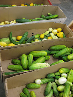 Amaranthus paniculatus) called 'Autumn Palette'. Although we've grown many amaranths in the past, this one is new to me and I'm glad it is coloring up like its description (cream and biscuit tones). Most amaranths are a solid color so this is a neat effect on a 5' tall+ plant. To the right is another collection of cucumbers picked by Janice's volunteers this past Saturday. Bev D. hauled these to the local food bank today where I'm sure there were comments about the weird looking cucumbers. Below is a close-up of the marbled nasturtium (