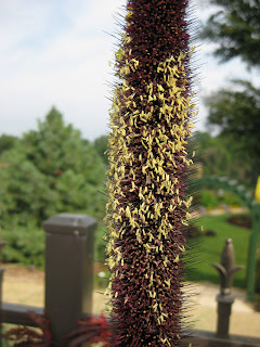 Pennisetum glaucum 'Purple Majesty') starting to go to seed and being quite attractive to the yellow finches. This species of millet is also called pearl millet and is a very important food crop, particulary in Africa. We are growing four varieties of this species known for a more ornamental leaf coloration ('Purple Majesty', 'Jester', 'Purple Baron', 'Jade Princess') and as an annual grass, they are all effective in the border or container (research their variable heights though). To the right is the 'Bull's Blood' beet (