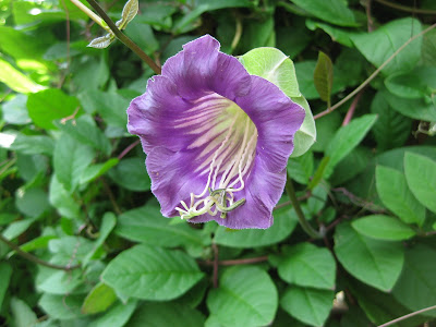 Cobaea scandens) which is also called cathedral bells. This annual vine is always vigorous for us in terms of stems and foliage but not real heavy on the flower power. However, the blooms are exquisite and quite large (2" in diameter).