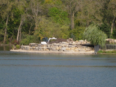Work continues down around "the point" each day. Todd and his workers from Nature's Touch have done a nice job on the retaining wall and most of their handiwork can be seen below. Dr. Yahr has been offering advice and keeping an eye on things out there too. He has a great eye for detail. This view is from across the pond from the boat launch. The terracing looks good and we'll soften that look with plantings as well. Our hope is to still put up a seating arbor on that point (in October) and address the landscaping next spring.