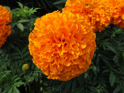 Tagetes erecta) that has 3-4" diameter blossoms on 24"+ tall plant and really glows this late in the season. Next picture down is the bold, maroon foliage of the castor bean plant (