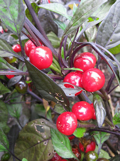 Capsicum annuum) variety that has the nice dark foliage as well. To the right are the fruiting structures of the balloon plant (