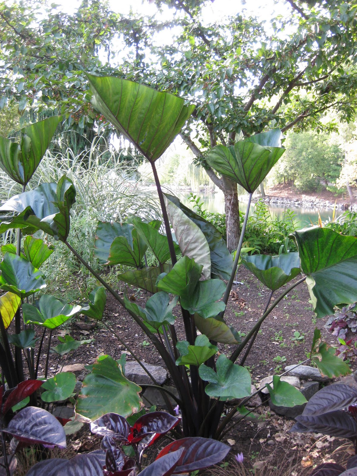 Colocasia esculenta) and we have some topping 7' tall right now. The leaves are really neat and the stems at ground level are jet black. I've already reordered this one and five or six other cool ones for next year. In close proximity is the increasingly interesting and showy ebony plant (