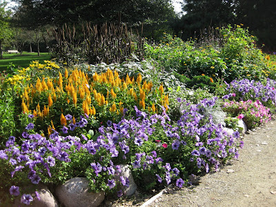 Juniperus chinensis 'Fairview') hedges around the reception garden. We had plenty of volunteer help in the plant sale and Kay was out tidying up the beds for our tour tomorrow. Debbie helped weed and water as well later in the day. Our annual beds are still hanging in there (see below) despite very cool mornings.