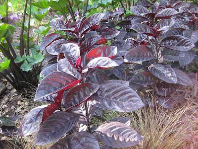 Pseuderanthemum atropurpureum 'Black Varnish') seen below. These are almost 4' tall and the leaves would rank up there as the darkest I've seen on a tropical. We're not worried about blooms although I've seen this plant blooming in the Philadelphia area with deep magenta flowers.