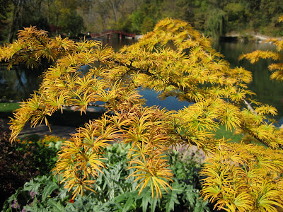 Pseudolarix amabilis) in our "larch area". As a deciduous conifer, this tree has green needles from spring until fall when they turn this nice golden color and drop. The picture further below and to the left is the same tree. The yellow really was an eyecatcher today and our larches (