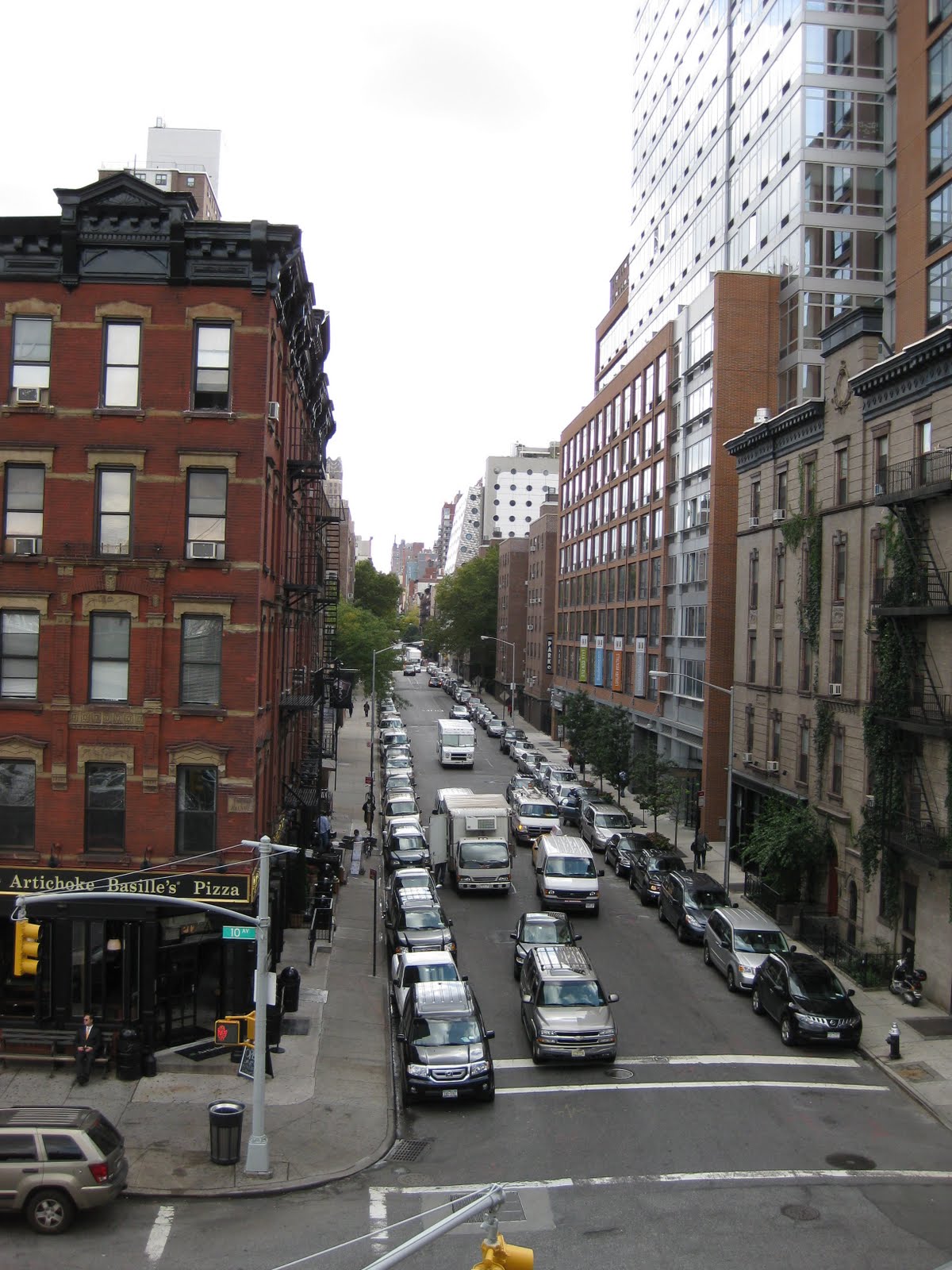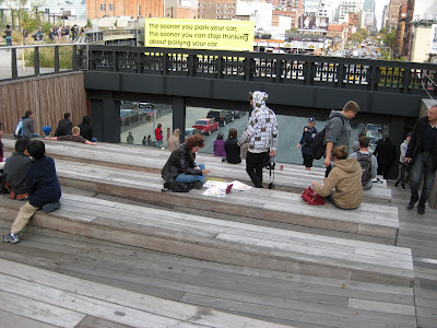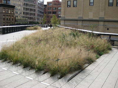 The High Line was originally built in the 1930s as a means to lift freight trains 30' over the street level and remove them from general traffic. The last train to run on the tracks was in 1980. When the tracks were in threat of demolition, the Friends of the High Line was formed in 1999 and began the process of creating an elevated park in this location. In 2003, a competition called "Designing the High Line" attracted 720 proposals from 36 countries. Ground was broken in 2006 to install the winning design. As seen in many of these images, segments of the track are exposed and incorporated in to the design. The paving system for the walkways collect and redirect all rainwater to the beds or storage cisterns. The entire project was awesome although I was disappointed to see that only about half the park is open to the public with the remainder being opened next year. Feel free to GOOGLE this park or look in to its history. It was heavily used the day (last Thursday) that Cheryl and I walked thru. We talked with a park volunteer about the history and he loaned us some neat references regarding the specific plantings and construction details of the park. It was darn cool and I recommend it to everyone. It was very unique and there was a section (pictured further below) that had sloped seating facing a huge glass wall where you could look down at the street and people watch. The park would alternate between emphasizing its heritage (and height off street level) and hiding it and making you feel like you were in a typical park or plant restoration area.