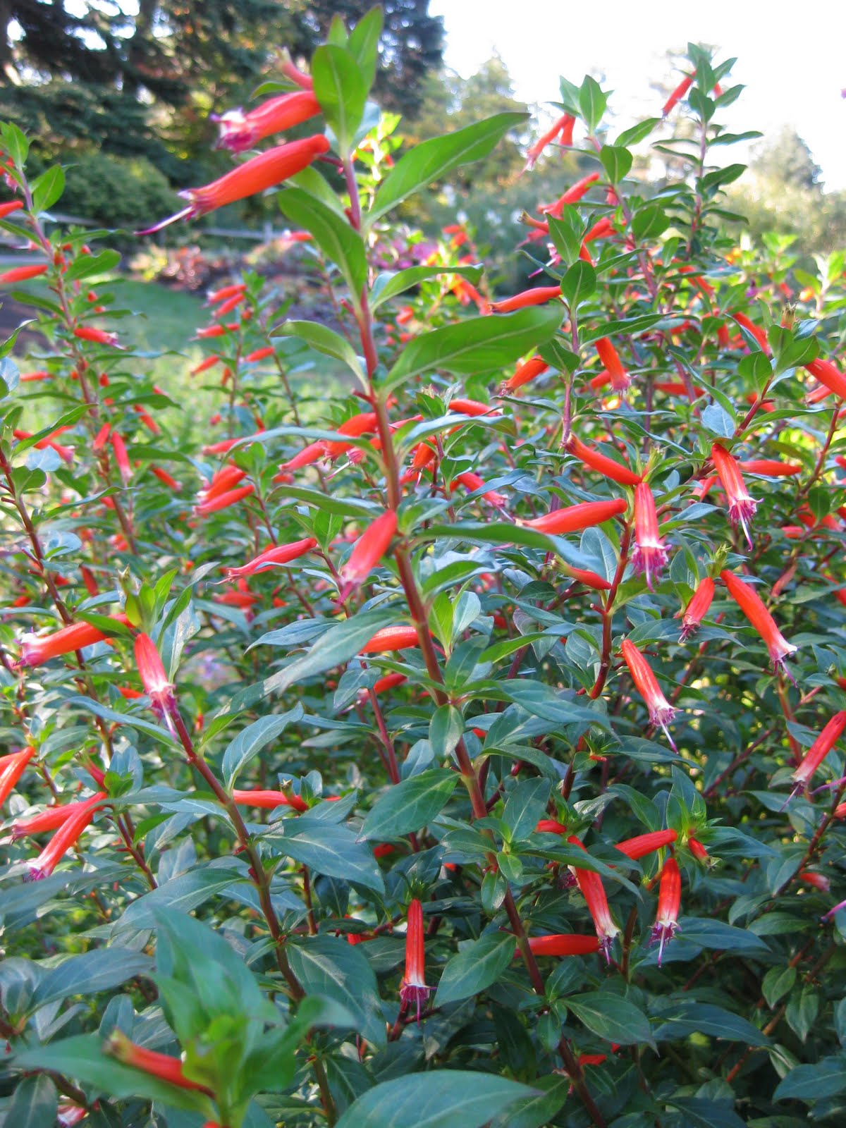 Cuphea ignea 'David Verity') that not only has unique tubular blooms (great for attracting hummingbirds!) but also has a long period of bloom until hard frost. To the right is an interesting grass with economic importance. This is sugar cane (