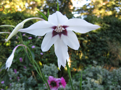 Acidenthera bicolor). The Latin name has changed so much I'm not sure what is official but as a summer planted bulb, we like to start them early in pots (April) and stagger the timing of when they are planted so we have them peaking at different times late in the season. We plant these after June 1 out in sunny spots around the gardens. April planted peacock orchids will bloom in September for us! To the left is a neat "cigar flower" or "firecracker plant" (