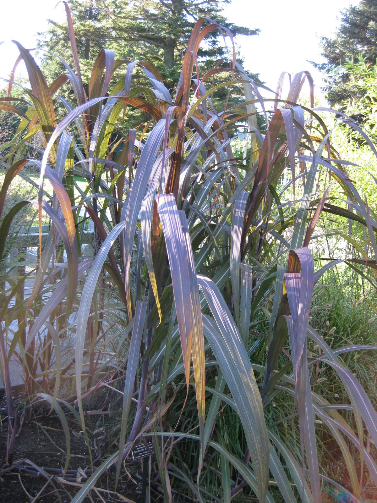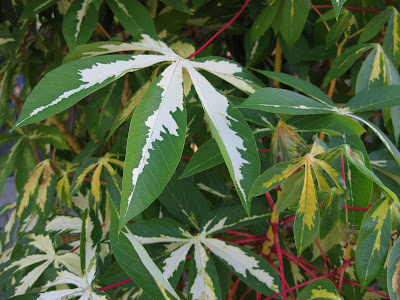 Saccharum officinale) but while sugar cane is green, this is the dark maroon variety called 'Pele's Smoke'. I've seen this variety reach 12' high at the Indianpolis Museum of Art (awesome gardens around the campus by the way) and it was very impressive. We've also grown this at RBG. Further below is the variegated tapioca or cassava plant (