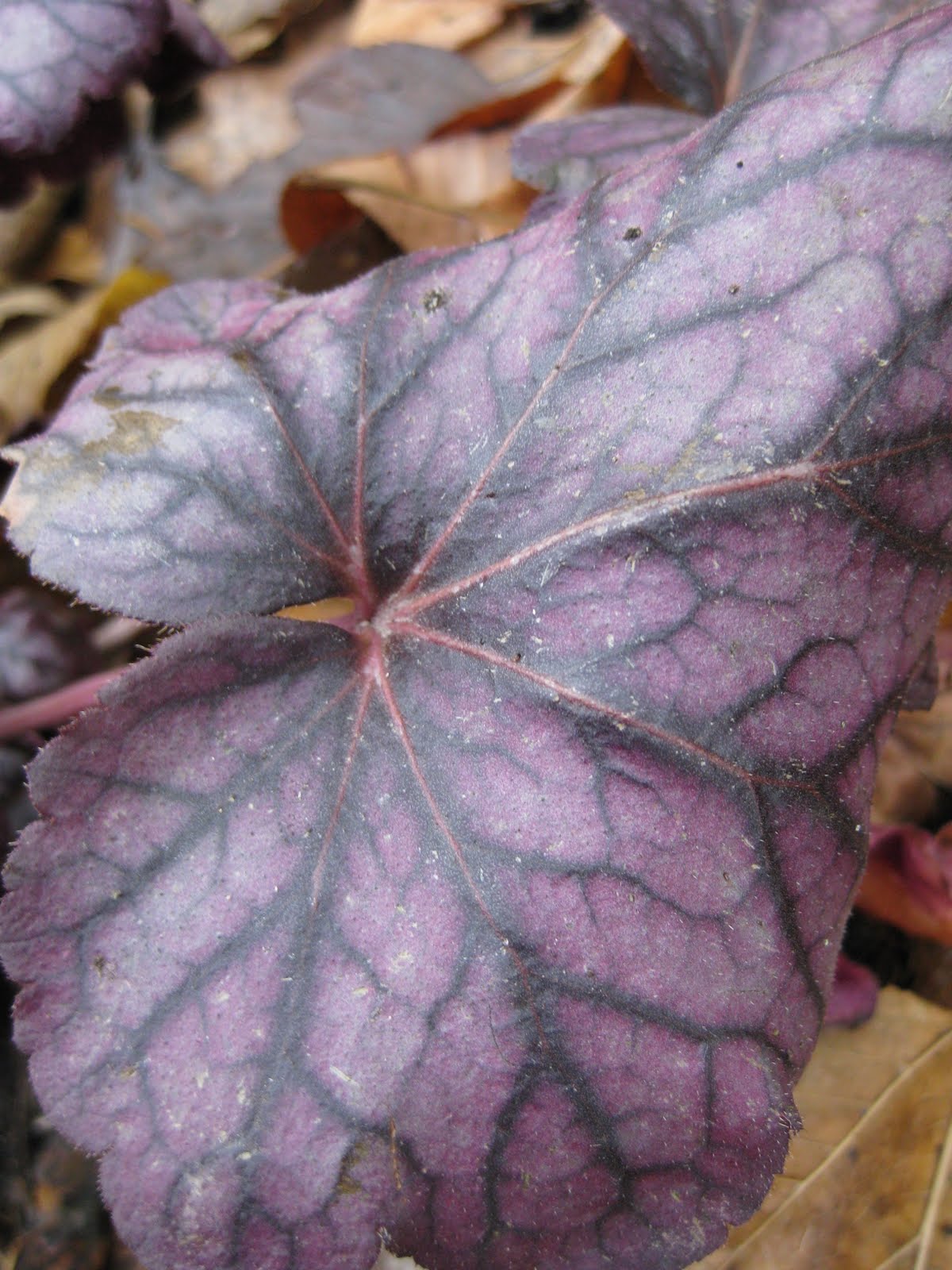 Heuchera). I like this variety a lot as well as any maroon leaf varieties with silvering and dark veins. With 300+ varieties of coral bells available, it's important to not only pick your favorites but understand their needs (moist, organic, well-drained soils). To the right is more perennial fall color with the transition to gold on these Japanese irises (