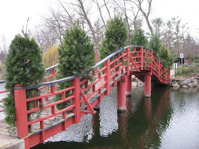 Iris ensata) in the Japanese garden. The night time temperatures over the next couple of nights may be our coldest and will steal much of the remaining color. However, we've been fortunate to have a very mild November. I just hope December is rainless and cold enough that we don't have "moisture issues" with our cords. A nice dusting of snow would be acceptable too. Below are some images of our arched bridge this morning. Note the seven trees that Marv & Terry secured on the bridge. These all have bright blue LED lights that will look great. Next week we'll test the show and see where we have to adjust and tweak.
