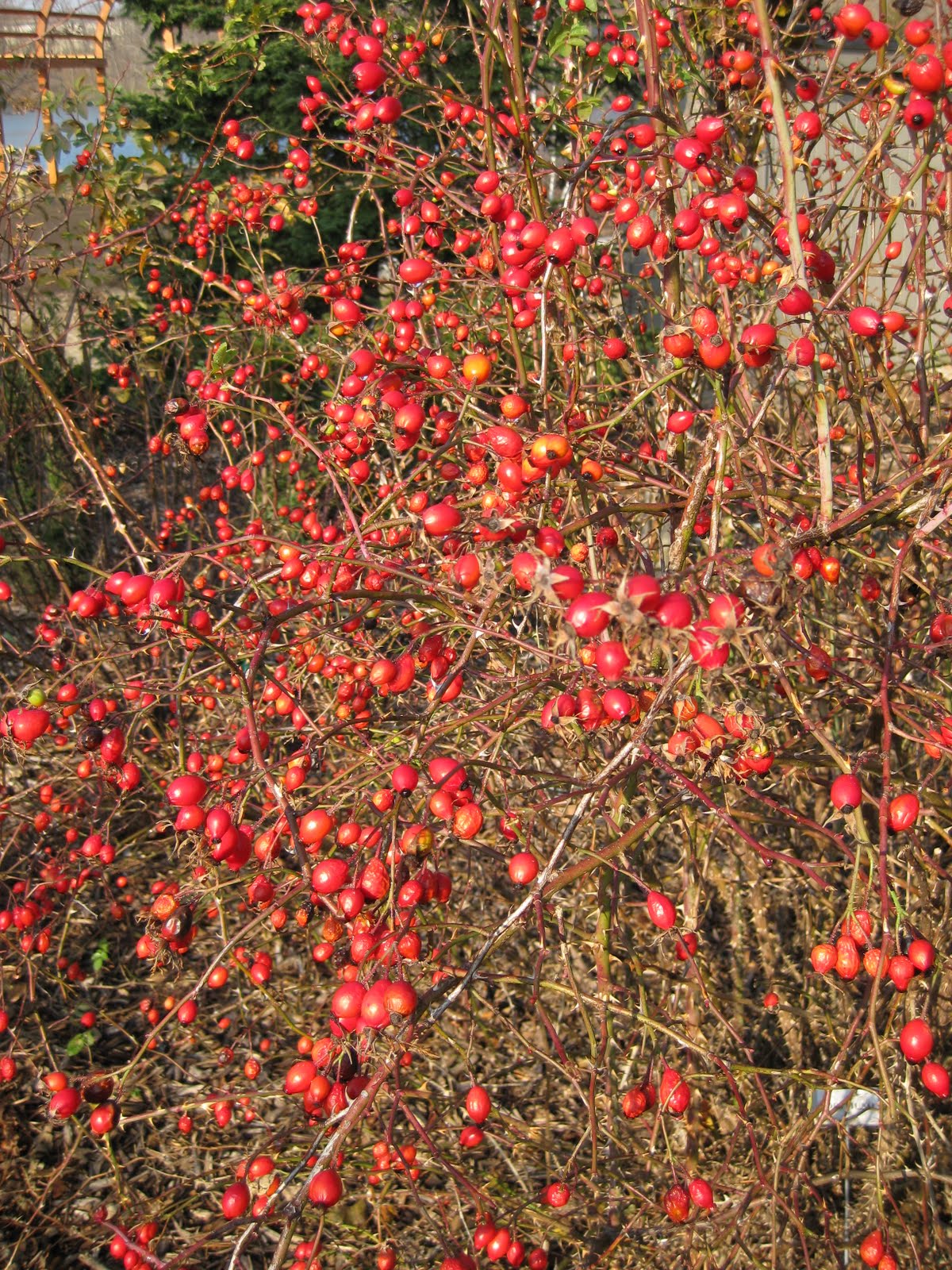 ect (for 2011) and was able to get out and garden. Big John spent time accessing our icicle lights that were "out of reach" and getting those wired up. He also spent a good portion of time cutting back roses and accomplishing some other gardening tasks. Shown to the left are the hips of the 'Dortmund' rose behind our French formal garden. I've shown these hips before but keep noticing this rose everytime I walk by. The fruit coloration "impact" rivals the flowers in my mind and are longer-lived! To the right is the perfect, upright form of the fastigiate European hornbeam (