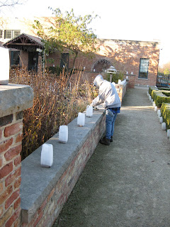 Thuja occidentalis) hedges. Janice worked on decorating obelisks as can be seen above as she rotates a 9' obelisk and secures the lights. She has this down to a science and will have decorated close to 30+ obelisks that will be placed in strategic locations shortly by Marv and Terry. Janice also spent quality time in the English cottage garden cutting down perennials. We opt to remove as much perennial debris as possible in the fall as we are hard pressed for time in spring and lack winter visitors to enjoy some of that late season interest. Of course ornamental grasses are left up until next March. Big John emptied out containers, hauled containers, planted daffodils (