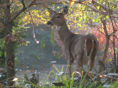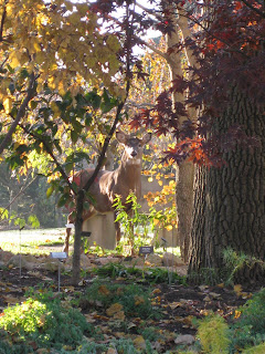 John mentioned seeing a buck out in the gardens today (see to the right, center of photo) and we later saw his girlfriend too (below). Next week we'll start pounding posts and putting up fencing to minimize their access to our tasty arborvitae (
