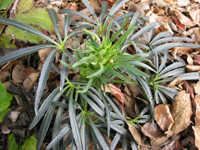 Helleborus foetidus) which retains evergreen foliage all winter but will bloom in late winter/very early spring and later send up fresh foliage. Marv an