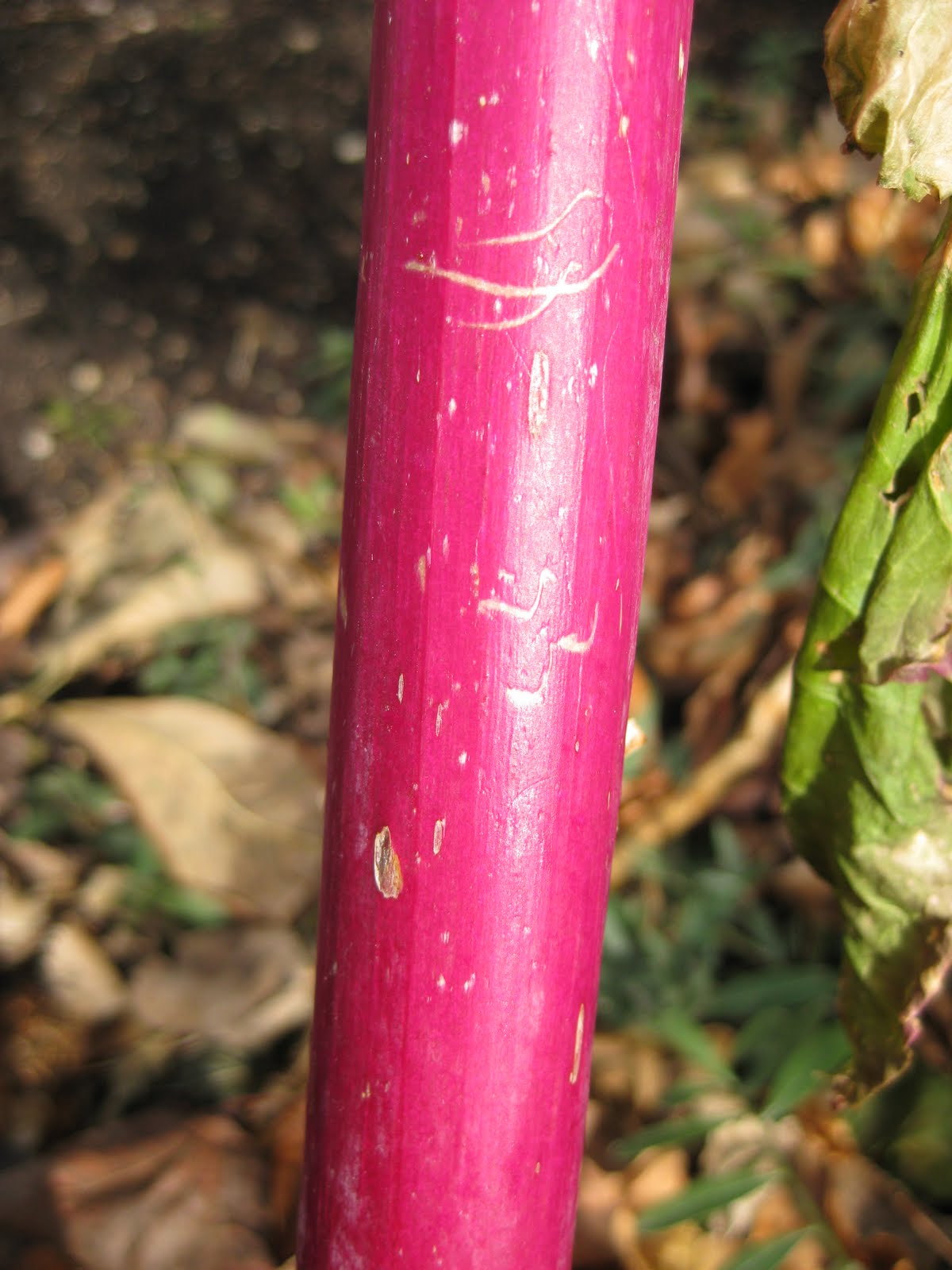Acer pensylvanicum 'Erythrocladum') that gets increasingly redder from October in to the winter. The stem to the right is from a native, non-woody plant, considered a weed by many. This is the vivid magenta stem of pokeweed (