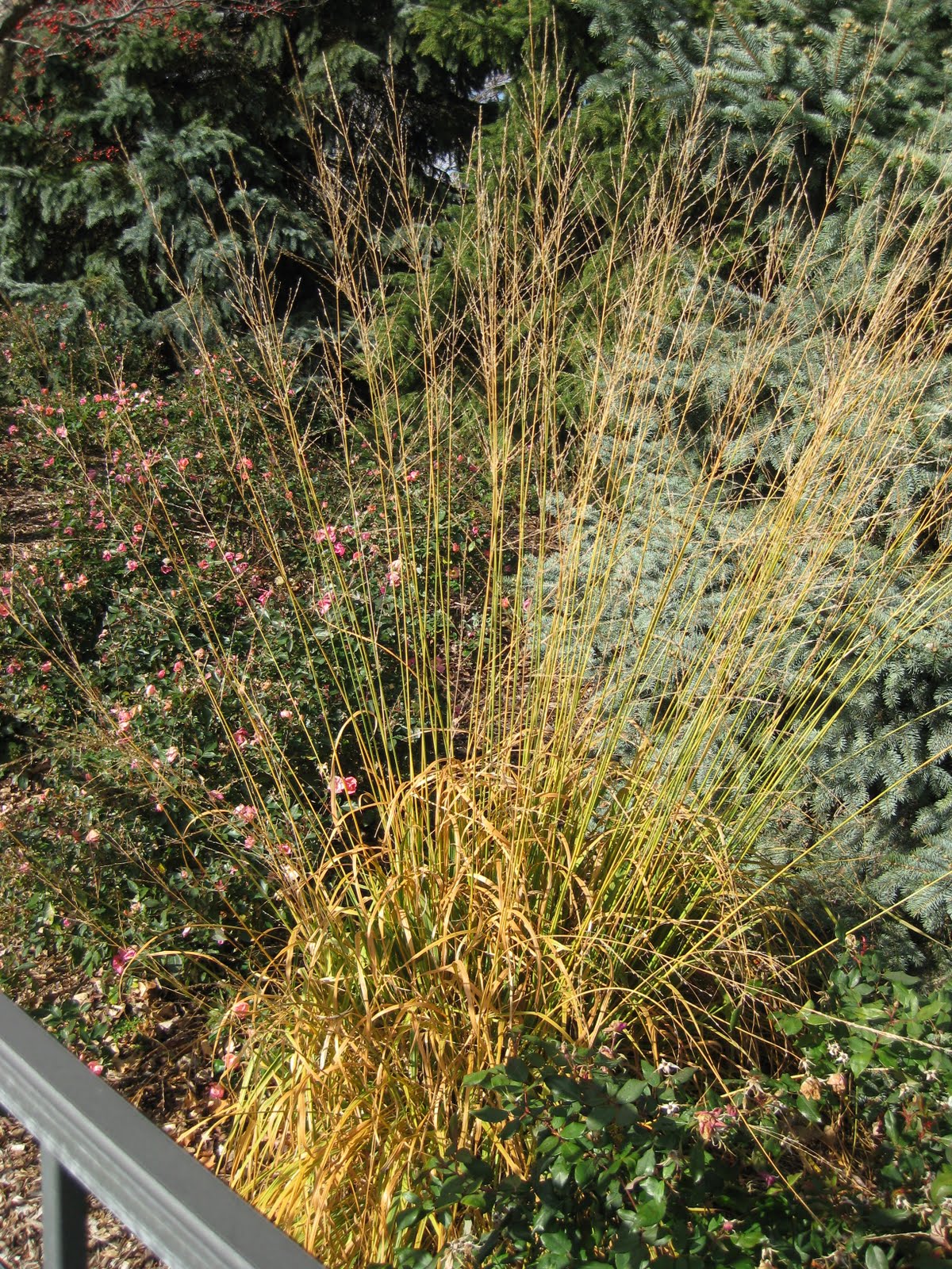 Acer triflorum). I love the appearance of this bark which gets better with age. In a recent blog, I showed the nice orange fall color of this smaller scale maple (20' or so at maturity). To the right is the golden fall coloration of the purple moor grass (