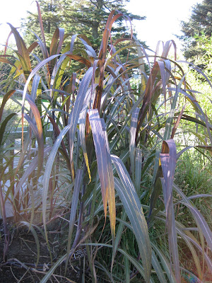 Muhlenbergia capillaris) which I noticed at the New York Botanic Garden. This is the first time I saw it in bloom with those wispy pink inflorescences and was very impressed. I've seen its picture in catalogs and always assumed the pictures photo-enhanced. However, the hazy pink was extremely ornamental and although native to North America, has a zone 6 hardiness ranking. Darn it. The bottom photo is a maroon sugar cane (