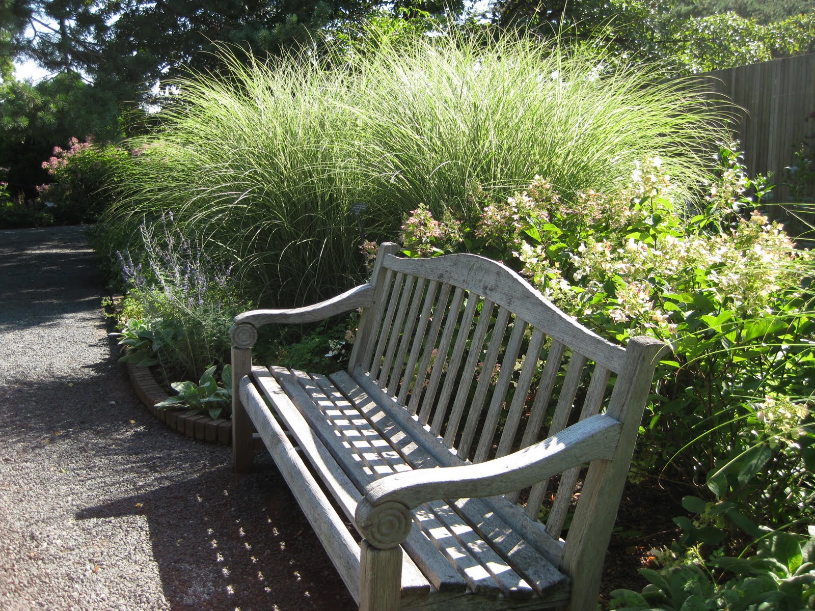 Miscanthus sinensis 'Morning Light') in mid-summer, offering texture and a nice anchoring point near this bench at the Chicago Botanic Garden. This is one of my favorite, taller grasses with very fine texture (narrow leaf blades). Whenever I've talked about ornamental grasses, I mention that although many have superior winter interest and while that may be their primary trait/contribution, they should also be good garden neighbors for other plantings and certainly have an interest during the growing season as well. I've been going thru many of my digital photos taken this year and am coming across lots of grasses that I saw in my travels. I've included only a few in this posting as this is the "tip of the iceberg" for what is available to the home gardener. Below is a strongly variegated Japanese silver grass (