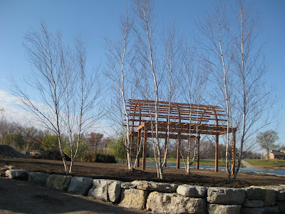 Hakonechloa macra 'Naomi') that I feel is exaggerated in catalog photos but still appealing. Below is a shot of our new structure on "the point" with the five new (and sizeable) 'Whitespire' birches (