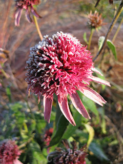 Abelia mosanensis). This 6' tall by 6' wide full sun shrub, while only hardy to zone 5, has unbelievably fragrant blossoms in early May that rival any fragrant viburnum and can be detected from a great distance. I've been impressed with this shrub and never hesitate to recommend it to others. We have a dozen specimens and while they aren't always uniformly round (a bit unkempt) the spring/fall combo of interest is worth the space. To the right is some light frosting (Tuesday) on a double coneflower (