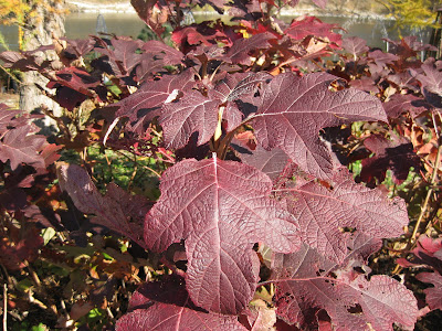 Calendula officinalis) which blooms strongly in spring and summer, will reseed and has edible flower petals. Pot marigolds have a long herbal history, come in many colors and are easy to find in seed catalogs. The bottom photo is yet another shot of the superior red fall color on our oakleaf hydrangeas (