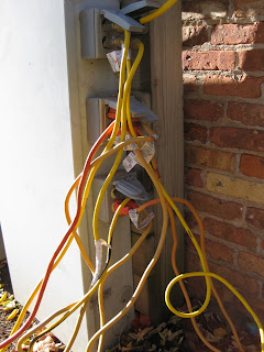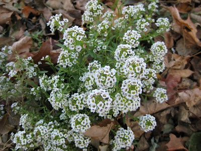 Populus deltoides). Kay continued her onslaught of perennial cutting and leaf collection in an area that quickly becomes knee-deep in leaves (cottonwoods!, ugh). I wish I could instill her attention to detail in everyone that helps here, including myself! We also saw Maury, Beth, Julie and others as well. My work duties can be summed up with the picture to the left. I'll have a solid three weeks of running cords from this point on and if Mother Nature cooperates, we should have the lights show close to done and the gardens put to bed in the next two weeks. We'll see how that goes. Below are some of the remaining vestiges of interest out in the gardens. The top image is of sweet alyssum (
