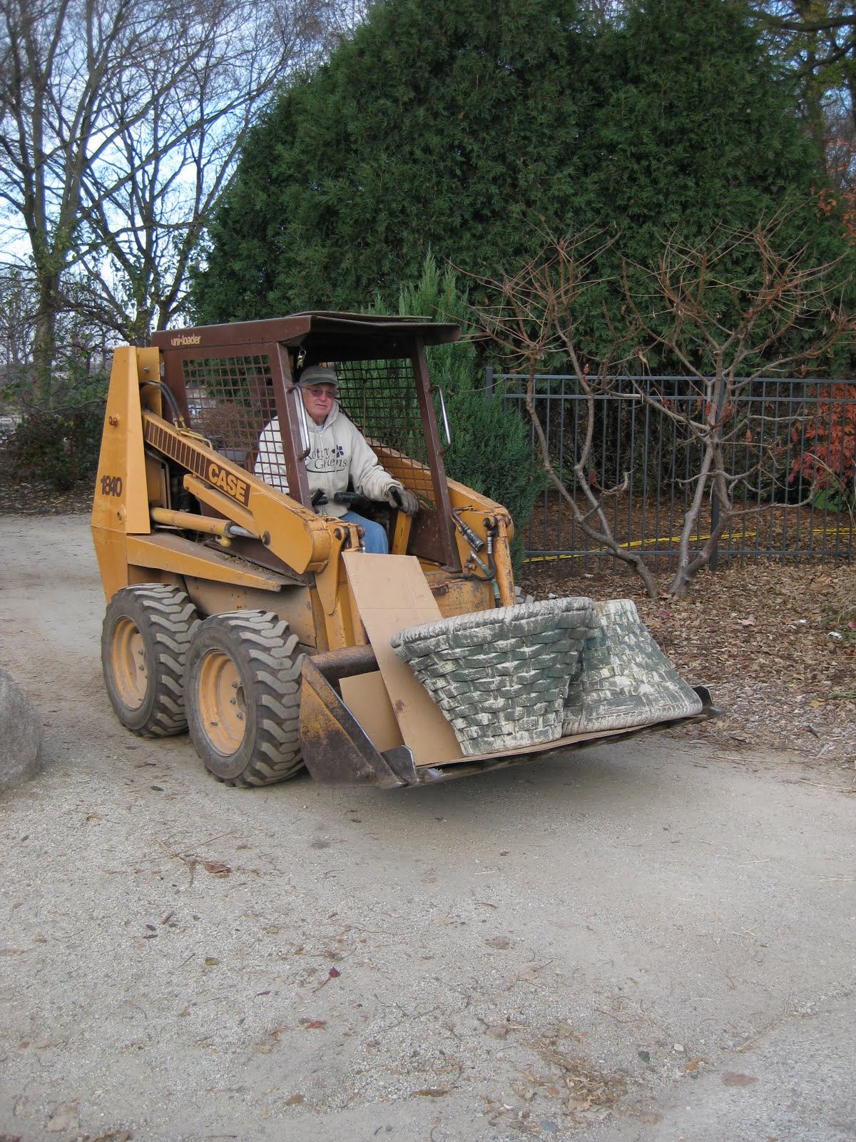 arv to the right). Marianne continued her luminary work and is almost done with that task aside from some tweaking. She also found time to sweep up the entrance garden and collect debris piles. Larry ran out for supplies, worked on his "lights pavilion" project and helped facilitate the four LP Tree Service guys that came down to help put up lights with their bucket trucks. These guys are veterans and we appreciate their time (and the value of "cherry pickers"!). Little Jerry worked on pruning and began the arduous task of pounding stakes around our tastiest (for deer) specimens in the Japanese garden.