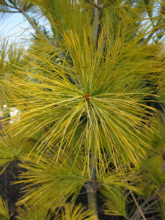 Pinus strobus). "Chartreusy" in summer, this conifer becomes more gold as the winter progresses and has peak color by March or so. We have a small specimen (8') but it will be nice to see it gain size over the coming years. I hope the deer stay away from it as they are not shy about getting back at us for blockading the arborvitae (