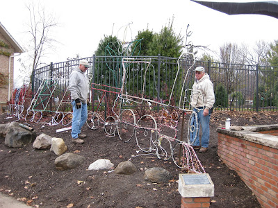 Carex appalachica) that is native to the dry woodlands of Eastern North America. This fine textured sedge is a nice clumper and tough as nails. The bottom photo shows Marv and Terry from yesterday, securing our train display which had sat dormant and in disrepair until it was resurrected by Randy. Tomorrow I'll be part of some filming that will be focused on promoting our lights displays.