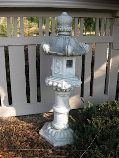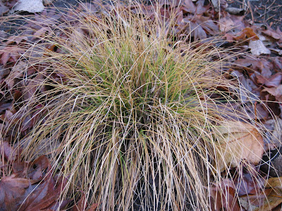 Dianthus sp.) in the alpine garden. Dianthus will hold leaves late in the season and that blue is quite evident, even from a distance. To the left is one of many ornate Japanese lanterns that we have near the Japanese garden. Below is the billowing seedhead of a goldenrod (