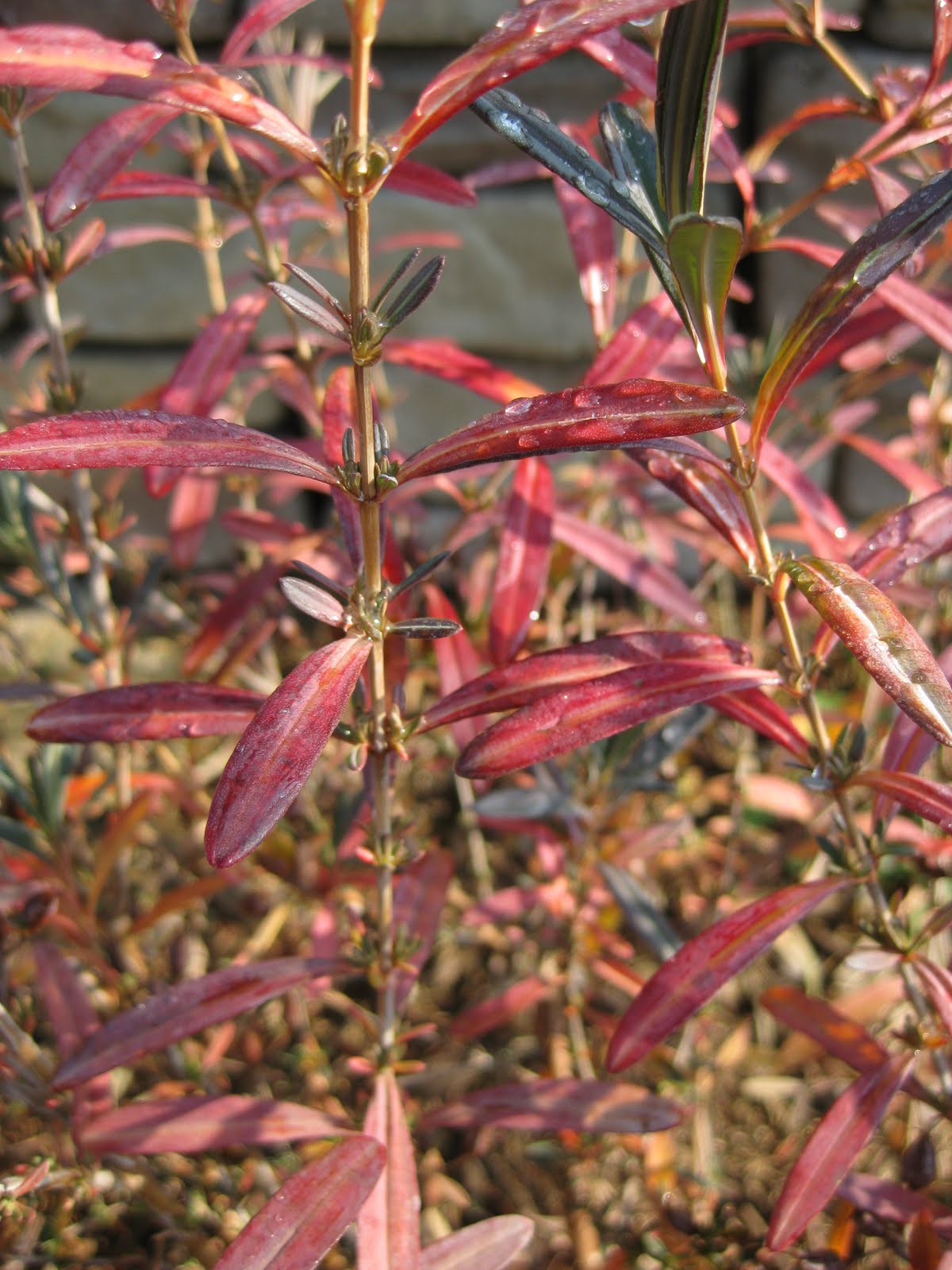 Hypericum kalmianum) which is a nice compact shrub (3'x3') for our area. This variety is known for aromatic blue foliage and yellow summer blooms. This species of St. John's Wort naturally has bluish foliage but this variety has very blue leaves. Well, now I've noticed a nice maroon/red fall color. Neat. Do look up this species (and perhaps variety) to see the neat summer flowers on a very low-maintenance shrub. We have maybe a dozen