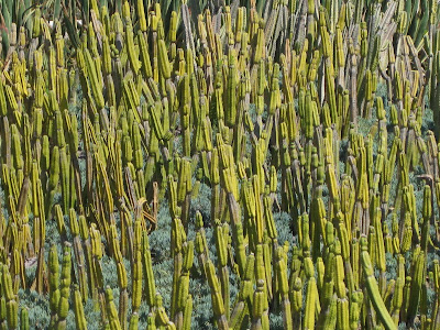 Vertical elements are absolutely essential in most garden areas and situations. Notice the use of the word "elements." These upright elements in the garden can be plants or objects. Their intended function is the same; to engage they eye, lead the eye through the composition and lend a sense of scale to the garden space itself. The use of vertical elements can be on a 20 acre estate or in a small container. The concept is the same. Above is a grouping of upright cacti at the Getty Museum in Los Angeles. When a narrow, vertical element is repeated strongly, it can be a very powerful design effect. This effect is also used in architecture. However, out in the garden, it can be cacti as seen above (not for us in WI!) or perhaps ornamental grasses like the narrow and upright 'Karl Foerster' feather reed grass (