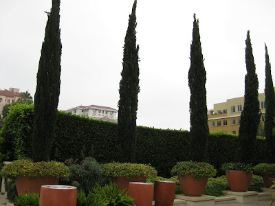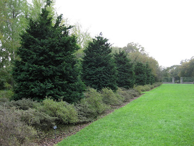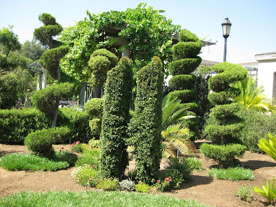 Conifers and evergreens are logical living elements for a vertical effect. Regardless of your climate, there are suitable species and/or varieties that lend themselves to this use. Now, these "exclamation points" as they are frequently called, don't necessarily have to be uniform or extremely narrow. The selection of their form, while perhaps important to the overall design effect, may not be as vital as choosing their locations. Vertical elements can be situated to be focal points; drawing the eye immediately to that location, or can be used as repeated elements to help unify and define a space. The selection of appropriate conifers and evergreens should of course take in to account the cultural requirements of the plant itself but should also be considered for their value as neighbors to other plantings and their overall impact as a vertical plant. Maintenance is also a consideration, particularly if their is much pruning/shearing/control, etc. as seen below with these woodies at the Huntington Library, Art Collections and Botanical Garden (Los Angeles). Other examples of evergreens used for an upright effect are upright cypress trees used in Pasadena and the repeated use of Japanese cedar (Cryptomeria sp.) at the Brooklyn Botanic Garden in a formal garden expanse.