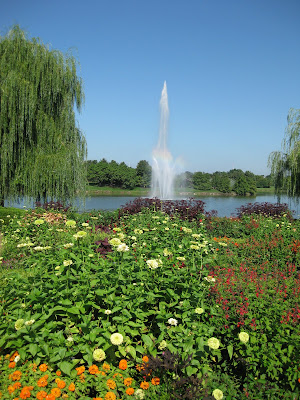 As we consider our landscapes and gardens, we tend to look at open space at ground level for gaps that need filling or perhaps the desire to add a certain color and texture. There is nothing wrong with this approach but we need to consider the obvious and that's the fact that we garden in three dimensions. While plants will certainly gain in height, we need to carefully look for additional opportunities to supply specific upright elements for that strong vertical in any space. While plants can accomplish this goal as seen above, non-living elements can have a similar effect. Non-living elements can also contribute other features to the garden like color, texture, sound, etc. Below is a beautifully stacked, boulder pyramid at Northwind Perennial Farm near Lake Geneva, WI. This is the centerpiece, or focal point, of Roy Diblik's "Know Maintenance" display garden. Plantings around this pyramid represent different maintenance levels with the intent of displaying and promoting appropriate perennials based on the available time for maintenance by the home gardener. The pyramid is a strong vertical element in this large garden. Further below is a large fountain at the Chicago Botanic Garden. This water feature is sited so it is the distant focal point as seen from many of the shoreline gardens. While it is a strong vertical element (at 50'+), it also lends sound and movement to the garden as well. At RBG, we use lots of painted obelisks (similar to what is seen above at the Denver Botanic Garden) and have been using upright, cylindrical planters over the past couple of years. This year included 24" diameter, inverted culvert pipes as vertical planters in our maroon/red theme. The two pictures at the bottom show our use of 8", painted PVC planters that are a combination of living and non-living elements in this vertical contribution. The plant trailing out is the aluminum plant (