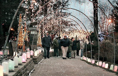 on Friday, December 17th (5-8:30pm). Larry and Bill are at work today doing some tweaking and path touch-up out in the show as we have to turn some of it on for a rental tonight. I'd like to mention that all four photos in this blog are of this years' light show and were taken by Dan Lassiter of the Janesville Gazette and are provided courtesy of the Janesville Gazette. I'll be promoting this event live on NBC 15 up in Madison early on Saturday, December 18th and our marketing push will be in full swing next week. Understanding that Mother Nature can be quite fickle and is beyond our control, we hope for some nice nights and manageable snowfall to make the show look nice and bring in our goal of 10,000 attendees. This is an important fundraiser and the last of our 2010 budget year. Funds from this event pay our winter bills. The show started back in 1994 and was the idea of Kim Emerson, our Executive Director back then. This predates our new visitors center and involved indoor entertainment and snacks in the Rath Environmental Center and a poinsettia display in our solarium. This became very congested quickly as our facility was about 10% the size of what it is now. My understanding is that the first four years included about 10,000 lights in a short loop out through the English cottage garden and thru what we call the North American Garden, just east of the visitors center. Of course this event became more popular and when I started in July of 1998, I had experience with a lights show at Fernwood Botanic Garden in Niles, MI. At Fernwood (105 acre botanic garden and natural area), I was involved with all aspects of the set-up which was just as laborious as it is for RBG. We used to brag that we had 1 million lights at Fernwood! I now doubt that as I'm sure it was even less than what we have up at RBG (300,000). Who's going to count anyway? Well, I brought along (stole) the ideas of half gallon, milk jug luminaries, dangling icicle lights and staking up temporary trees with lights for effect. The show at RBG, in the winter of 1998, then became a different beast. The route was enhanced and the scale became 10x what it was the year previous.
