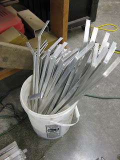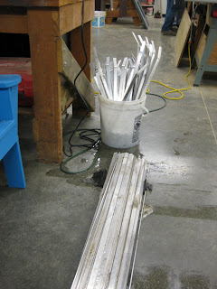 where. These are great winter projects and we probably had a good 15 or so people here today doing various tasks. Rose, aside from her culvert work, was here early to put the last coat of yellow on some containers (to the right) and Urban was briefly outside sizing up a return to crabapple (Malus sp.) trimming when it warms up. The yellow containers are structural foam and while very light, work well and are easy to convert in this fashion. They were all beaten up when we received them as a donation three years ago but they lend themselves to our color schemes quite well. The next two photos show the start of our aluminum stake processing project