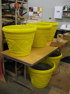 rowing season. While they were maroon in 2010, that color is "so yesterday," hence the conversion to a vivid yellow. We don't follow the color trends, we set them. Rose and Urban have been priming and repainting these and we'll be getting two more of this size for a nice grouping of five (2011 location is top secret). We've had lots of comments on these planters; some positive, some confused ("Are those culvert pipes sticking out of the ground?). The five big ones (24" diameter and 10' tall) will get multiple coats of blue paint and will also be going else