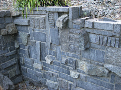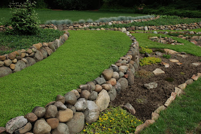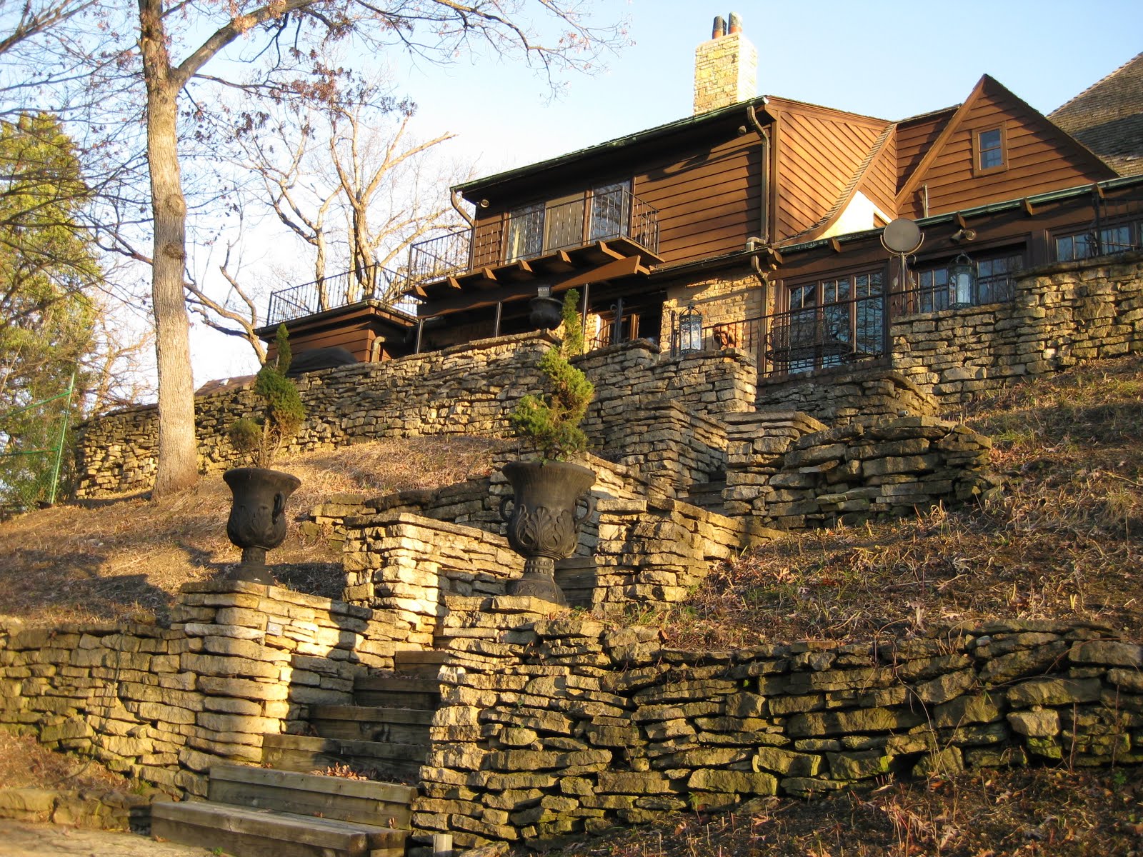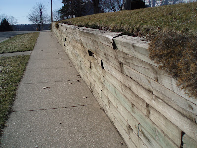 Today was another chilly one with minimal activity out in the gardens (if you don't consider all the deer tracks and their unsanctioned activities....). Larry and Bill were here early to make some modifications on our end loader for snow removal and made some corrections out in the lights show. We also have our heaters going in the koi pond now to keep some open water for oxygen exchange for the fish. I had a staff meeting and worked on lots of odds and ends. Jenny came in to start entering information for our new plant signs. She put in both woody plants and started on our fern collection as well. Dr. Gredler was here restaining benches and both Urban and Rose continued on the next coat of yellow paint on our culvert planters. Maury, Dick P. and Tom C. repaired some lights over in the gift shop and Maury then ran some errands for me; including getting some blue paint for future endeavors....We also saw Dave E., Big John, Mary W., Jim, Bill, Julie G., Jason and Mike M. at the horticulture center. If you are interested in contracting, building or repairing retaining walls, do some research or seek professional help prior to diving right in to the process. The intent of mentioning retaining walls in this blog is not to explain their constrution but to showcase their merit and the wide range of materials and styles that can be used to deal with grade changes and slopes. Well constructed retaining walls can be a wonderful asset in a landscape where changes in elevation are a consideration and/or desired. Proper placement of these walls can create level terrace areas for planting, minimize erosion and certainly eliminate dangerous maintenance areas where using a mower or string trimmer is frought with peril and potential injury. I've seen as many good (sound) retaining walls as I've seen failing (unsound) walls and the difference, while sometimes related to materials (and certainly $), really is commesurate with understanding the forces involved with RETAINING soil and significant weight. We can all purchase the materials (lumber, railroad ties, pre-fab block, flagstone, etc.) to build a wall but understand that when a wall goes over 3' tall, there are more considerations and the dynamics of proper construction increase exponentially. The third photo down shows a timber wall that I walk my dogs by every day and have observed the continued "battle" that will eventually conclude with that wall failing and needing to be replaced. While some of these walls are quite fancy and expensive, the overall design intent and function is identical.