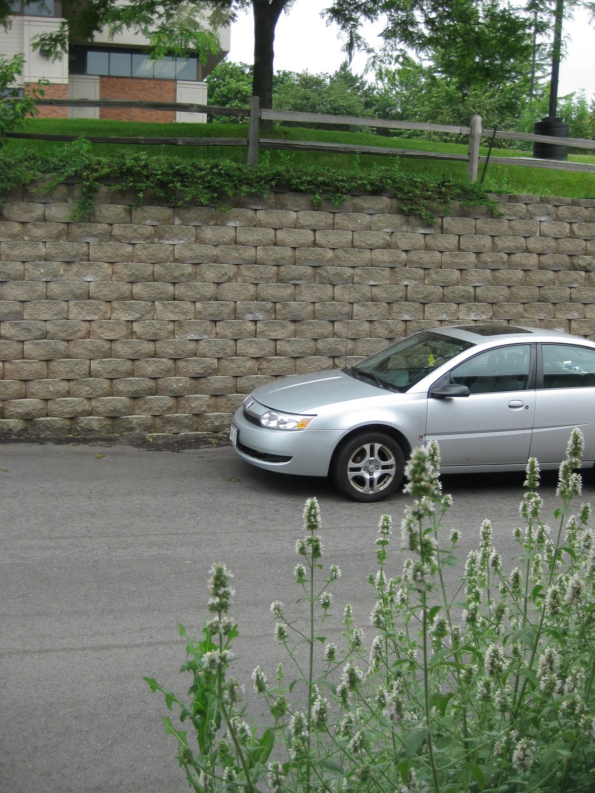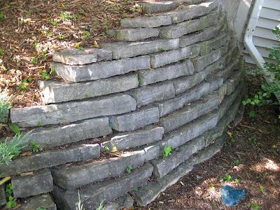 The block wall below defines our upper terrace garden with a 4.5' drop to grade where you see the road to the right. A wall like this includes an interlocking pin system and the use of adhesives. The materials of a retaining wall are a consideration but so is the lower stability of the wall which frequently requires compacted gravel and wall courses underground. Materials that back a wall like this include fabrics and clear gravel to allow water to pass thru and drain away from the wall (not mass behind the wall). This wall actually has perforated drain pipe behind it to vacate excess water under the road. Again, understand all components of a retaining wall, regardless of materials or height. Longevity is an obvious goal for any of these walls.