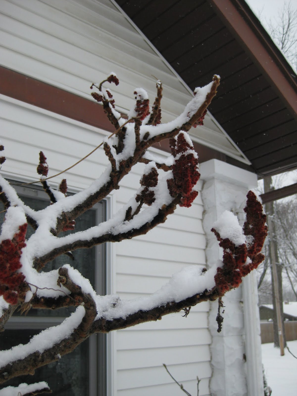 Rhus typhina 'Bailtiger') holding snow. Known for its bright gold foliage and red fall color, this woody plant also looks architectural in winter as seen above. This specimen is 12' tall so don't believe the descriptive tags when you buy one that says 6' tall at maturity! Below is a close-up of the curled needles of the contorted white pine (