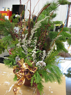 vitae), dried flowers, pine cones, etc. I've considered having winter container arrangements out in the gardens but I think they would be seen more by our deer population (and perhaps nibbled upon) than the sparse few visitors that wander thru the gardens in winter. I've seen nice winter arrangements at both Olbrich Botanical Gardens (Madison, WI) and the Morton Arboretum (Lisle, IL) as they have significantly more winter traffic and keep their entire garden paths clear for visitors. The pictures to the left, right and below give you an idea of some of the results of the two hour workshop. We hope to have it again next year so keep it in mind if you are in the area. What a nice final product for the front stoop or side entrance.