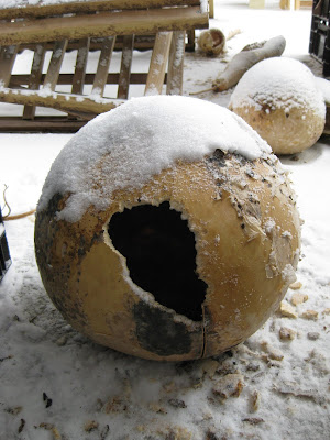 Urban and Rose were here to do some more work on the culvert pipes (seen above) and have done some more painting and prep as we'll be using these in our Garden Expo booth (see previous blogs about the Garden Expo up in Madison in February). Dick H. was here to help them out and we'll have some fun, cut stems and grasses (put together by Marianne) coming out of these uprights. Dr. Gredler continued his obelisk work and will add plenty of blue paint smudges to his painting clothes over the remainder of the week. Janice came in to work on spring plant sale tasks and Marv and Marianne popped in briefly. Marianne is doing a nice job sifting thru lots of historical pictures and information regarding RBG and we'll save all the relevant materials in a more accessible and safe format (not jammed in to old cardboard boxes!). We had a productive Garden Development & Maintenance Committee Meeting today (Gary, Maury, Dick P., Big John, Dr. Gredler, Hal, Carrie and Christine) and talked about our overall plan of attack for 2011. A big project will be landscaping the "North Point Garden" but it's an exciting piece of real estate with a beautiful view. We also saw Mary, Jim and Bob T. over here today. Below is both bad and good news. The bad news is that most of Janice's gourds that were drying for crafts next year (behind the Horticulture Center) have been pillaged by the squirrels. The good news is that the squirrels had a nice sustaining, nutritious snack! That was a bushel gourd by the way!