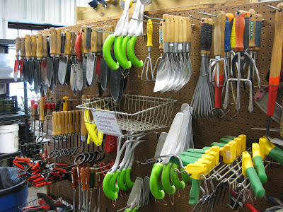 We had another good crew today with Larry, Marv, Terry and Dick W. heading out to remove and haul off about six trees that we've been waiting to take down. Dick H. was also here to assist as needed. We have some other "targets" out there and will address those this month. Urban was out to prune more crabapples while Pat and Dr. Gredler worked on painting the last our obelisks for this year. Dave, Vern, Bob A. and Jim worked on some special carpentry projects and have a full month ahead of them with carpentry projects (bench creation, etc.). Bill was in to help Larry later and Kay came in to work on her label processing. Janice was here in the afternoon and worked with Big John on their presentation for this Thursday evening (7 pm) entitled The Right Tool for the Right Job. Below is one of the ergonomic tool options that will be mentioned. We hope to get a great turnout for this event. We also saw Dave E., Jenny E., Chuck, Gary, Dick P.